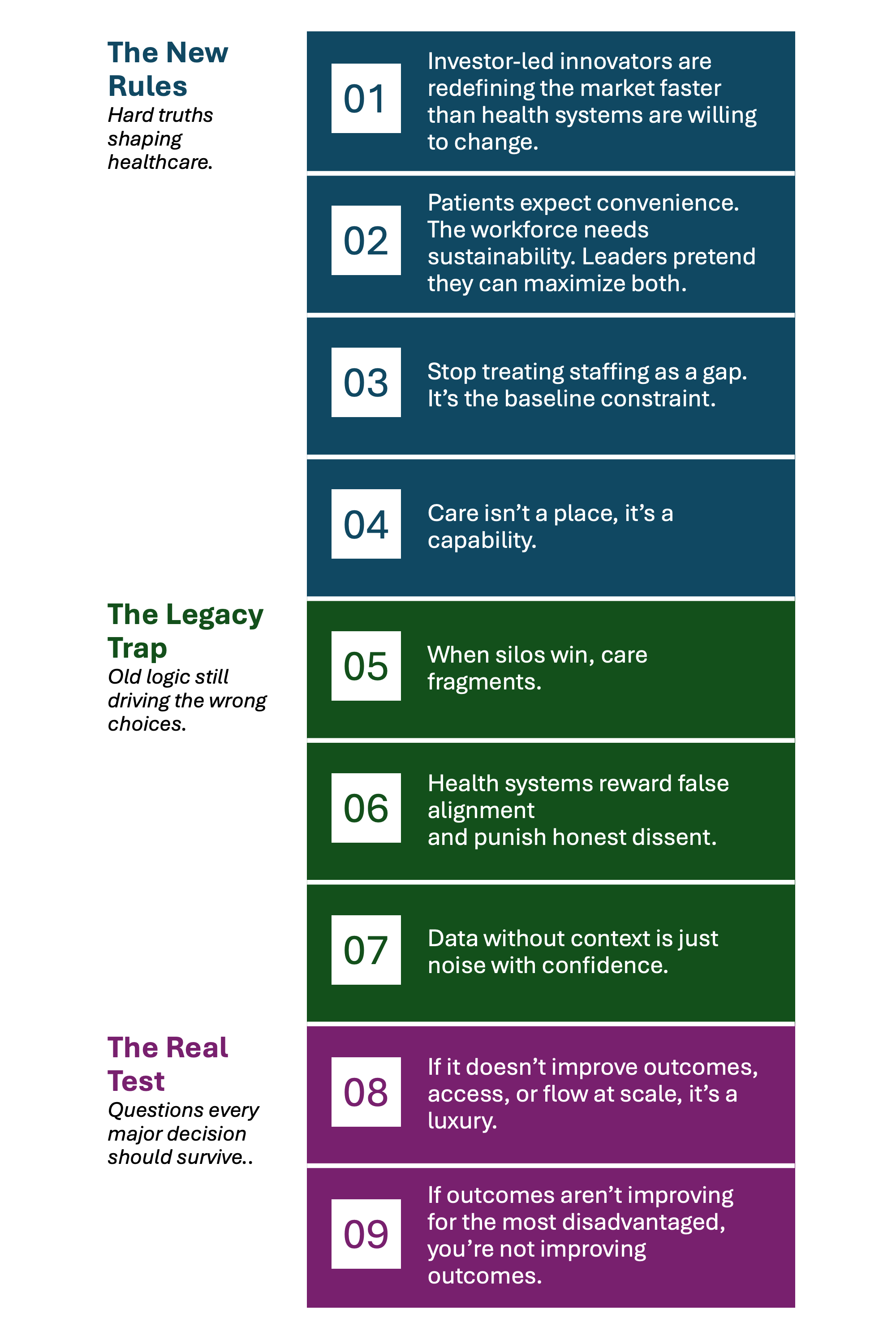 These axioms reflect the patterns, tensions, and truths I see repeatedly across healthcare strategy, planning, and transformation work. They are not meant to be clever. They are meant to help leaders frame decisions more clearly, confront tradeoffs more honestly, and plan for a future that will not reward inherited assumptions.